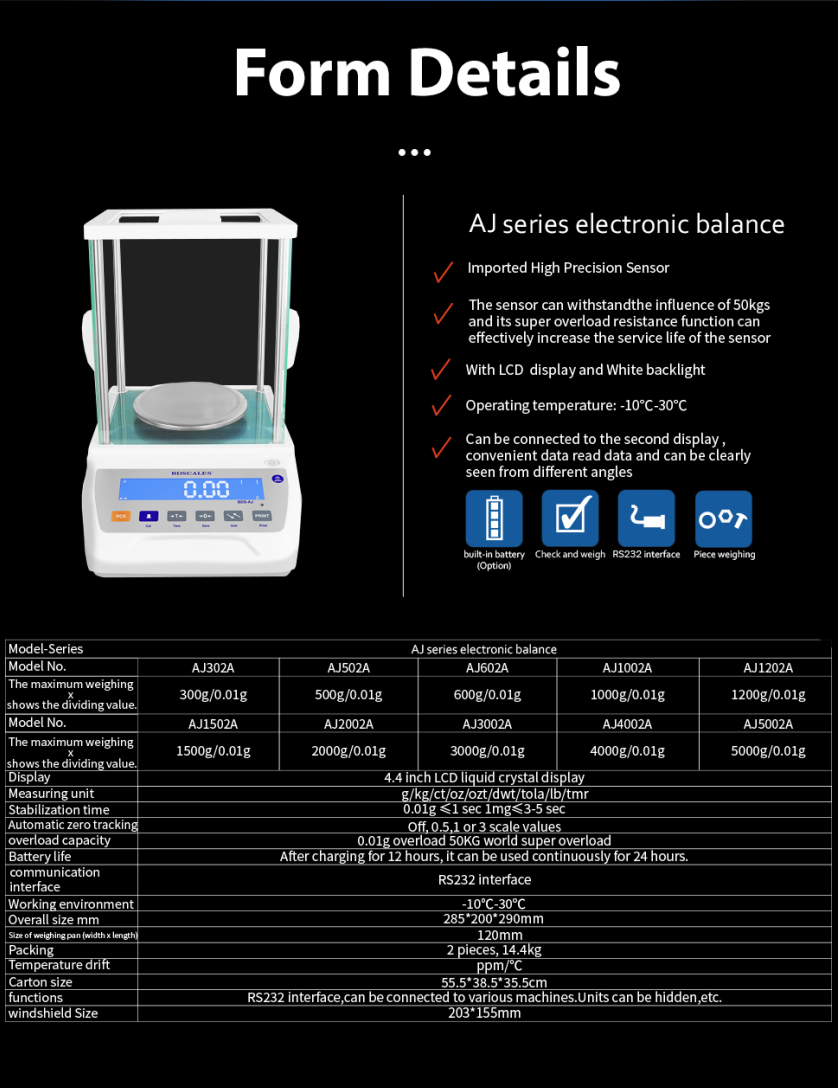 The AJ Series electronic balance is designed for professional analytical applications, featuring a 4.4-inch LCD display, high-precision sensor, quick stabilization, RS232 interface, and durable structure. Ideal for laboratories, schools, industrial quality inspection, chemical analysis, pharmaceuticals, and jewelry evaluation.