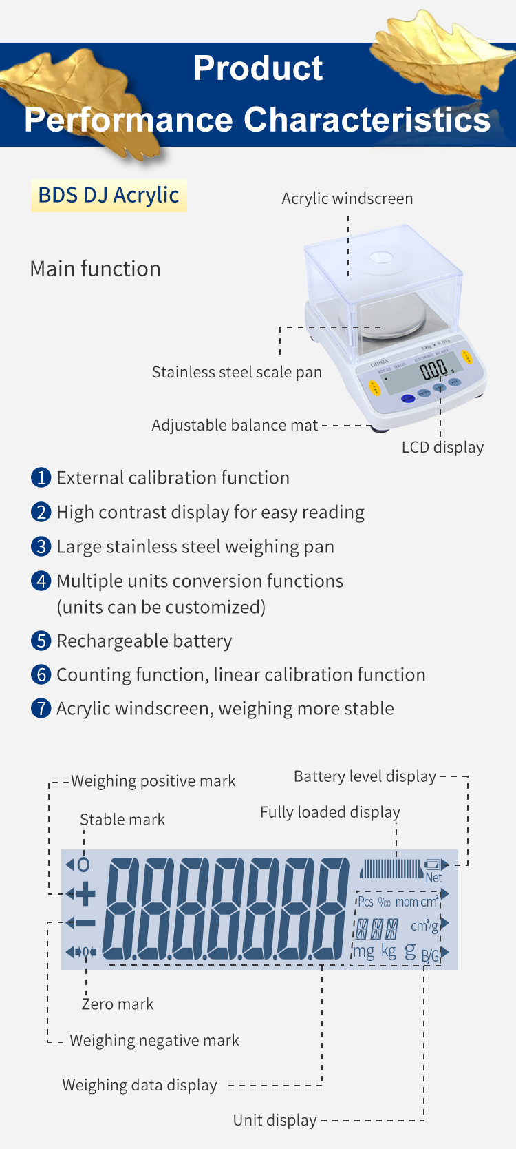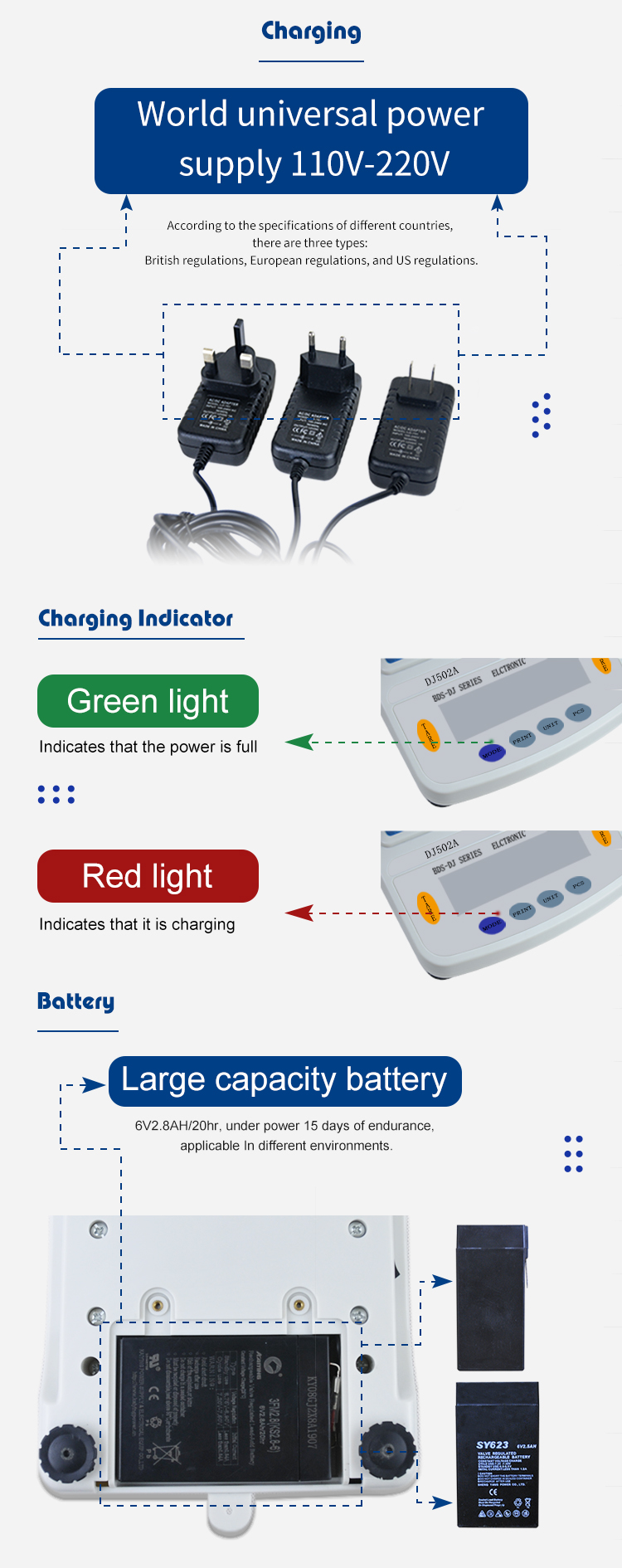 The BDS-DJ-A uses a 6V lead-acid rechargeable battery, which is safer and more stable than many lithium batteries. It offers longer standby time and provides stable power for high-precision weighing. A 12V/1A adapter is also included.