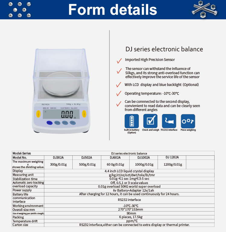 Available Capacities: 300g/0.01g,500g/0.01g,600g/0.01g,1kg/0.01g,1.2kg/0.01g