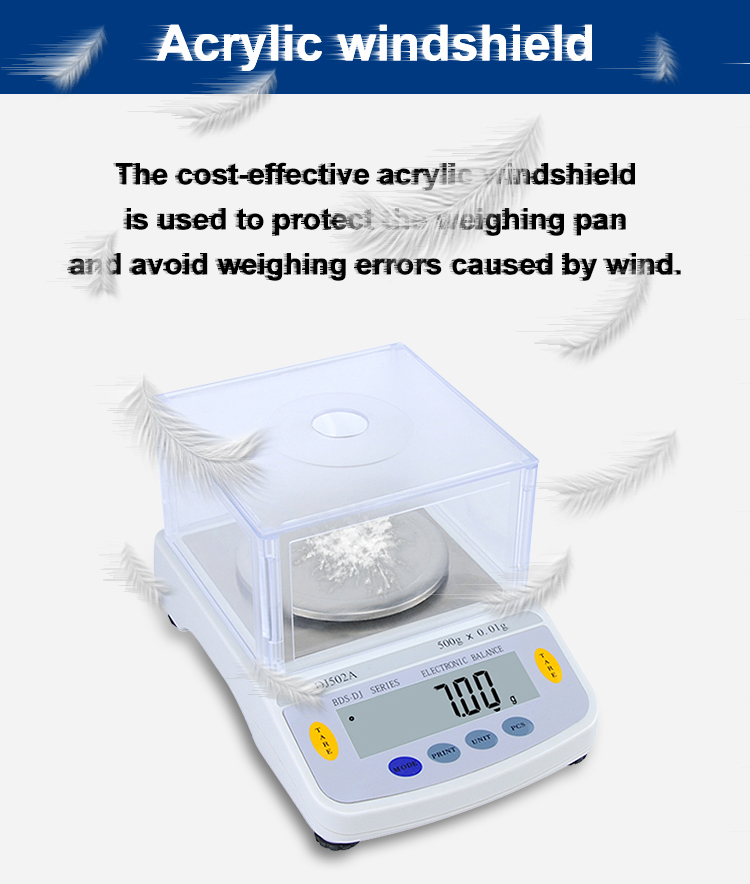 The acrylic windshield blocks airflow and environmental interference to ensure stable measurements. This is especially important when weighing small items like diamonds, gold powder, or chemicals that can be affected by even slight air movement.