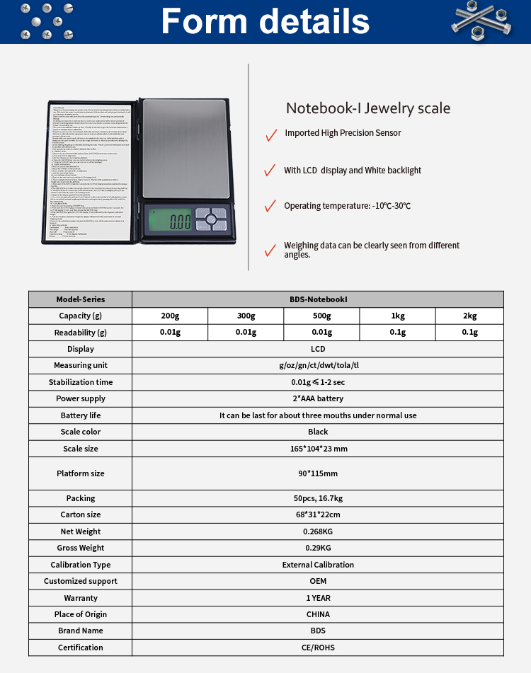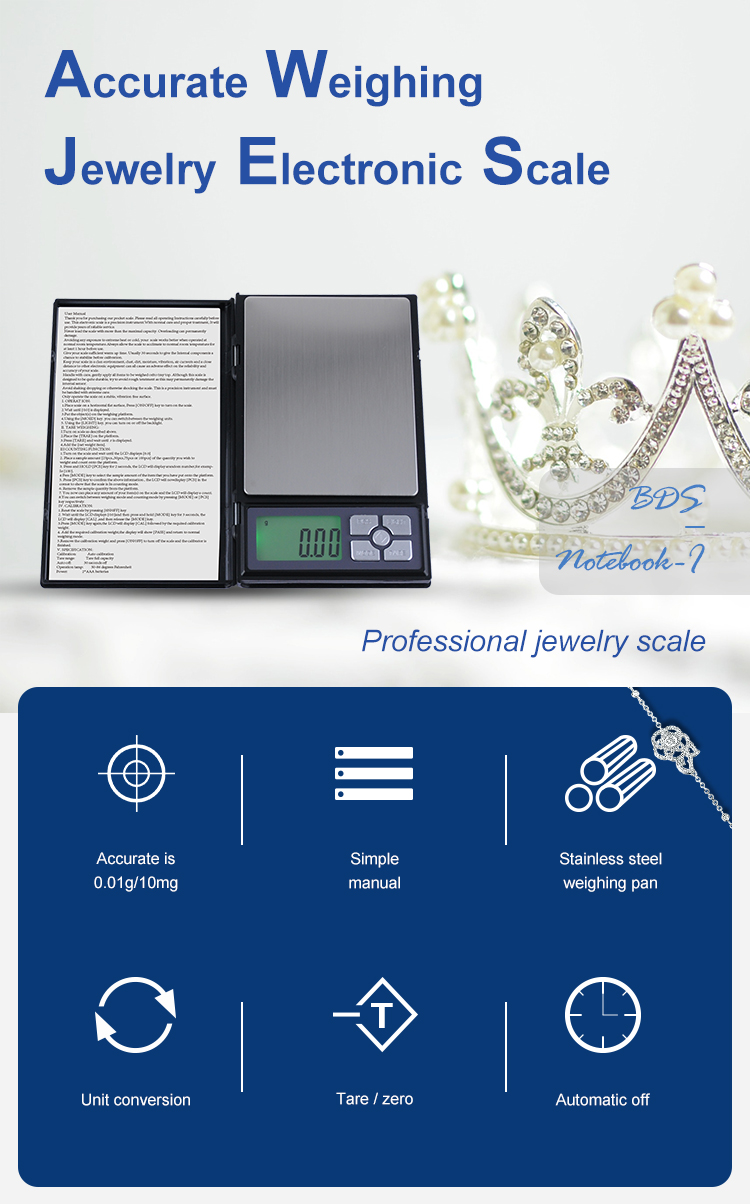 The BDS-Notebook I is a portable digital scale designed for users who need precision, durability, and convenience in one compact device. With its unique notebook-style design, protective lid, and high-precision sensor, this scale is ideal for jewelry shops, laboratories, kitchens, small-item weighing, and on-the-go measurement. As a factory-direct manufacturer, we ensure excellent quality, competitive pricing, and full OEM/ODM support.