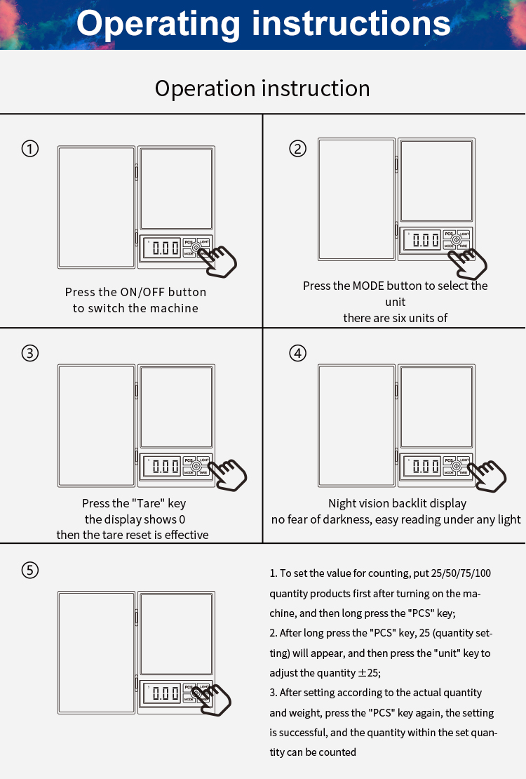 200g × 0.01g, 300g × 0.01g, 500g × 0.01g, 1kg × 0.1g, 2kg × 0.1g.